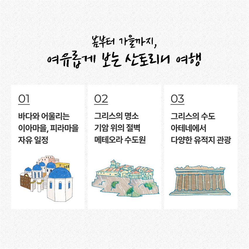 1. 왕복항공권(인천공항세,관광진흥기금 포함) 2. 전문 현지가이드 동반(그리스 현지에서 미팅) 3. 일급 호텔 숙박 4. 관광지 입장료 5. 산토리니 자유일정 6. 아테네 시내관광 7. 석양과 바다전경 감상 수니온 8. 기암 절벽 위 메테오라 수도원 9. 영화 '300'의 배경지 테르모필레 10. 1억원 여행자 보험 (자세한 내용은 하단 '여행자 보험' 참고) ※ 지중해 지역 특성상 현지 사정 및 항공사 사정에 의해 일정 순서가 반대로 바뀔 수 있습니다. 산토리니에서 개별여행 중 투어 예약 시 반드시 담당자와 현지 일정 순서 확인 후 진행하셔야 합니다.(빠르면 출발일로부터 7일 전~늦어도 출발 2일 전 관광 순서 확인 가능) ※ 이스탄불-아테네 항공편 사정에 의해 이스탄불 1박 후 그리스 일정이 진행될 수 있습니다. ※ 산토리니 지역의 경우 호텔 사정에 의해 호텔이 여러 곳으로 나뉘어질 수 있으나, 일행들분들 최대한 고려하여 배정됩니다. 나뉘어지더라도 최대한 서로 인접한 호텔들로 배정될 예정이며 호텔 체크인 모두 가이드가 안내해 드리니 양해부탁드립니다. |