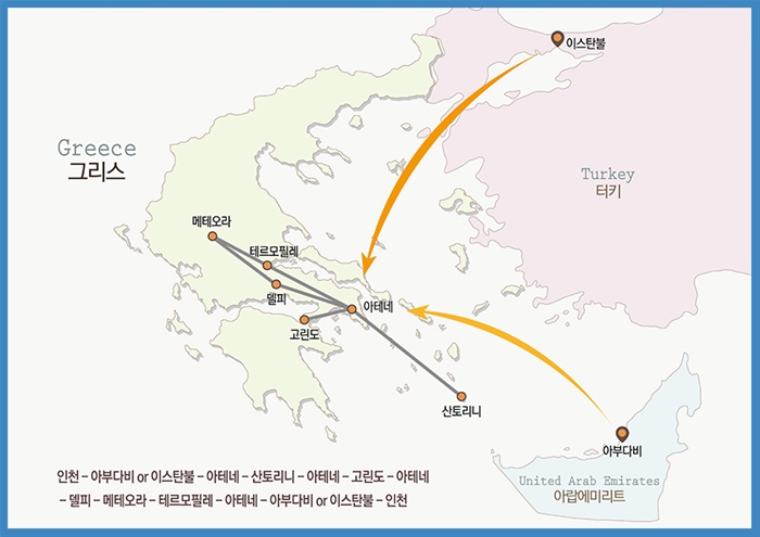 인천-기내숙박(1)-이스탄불 경유-아테네(1)-산토리니(2)-아테네(1)-델피 경유-메테오라(1)-테르모필레-아테네(1)-이스탄불 경유-기내숙박(1)-인천